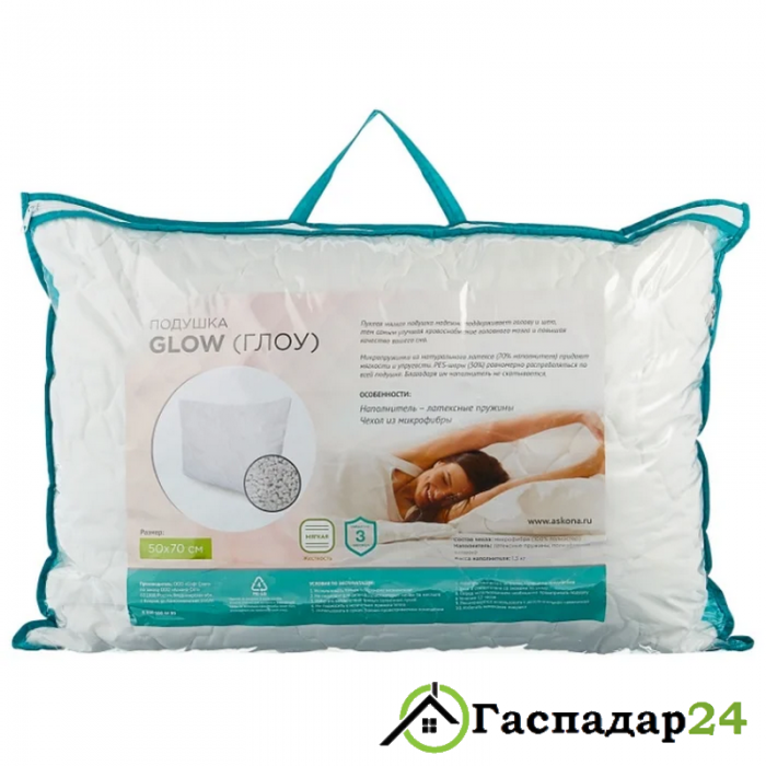 Пухлая мягкая подушка надёжно поддерживает голову и шею, тем самым улучшая кровоснабжение головного мозга и повышая качество вашего сна. Микропружинки из натурального латекса (70% наполнителя) придают мягкость и упругость. PES-шары (ПЭС) (30%) равномерно распределяются по всей подушке. Благодаря им наполнитель Glow не скатывается. Подушка хорошо сохраняет форму даже через годы использования.