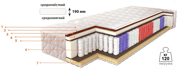 5.Блок независимых пружин зональный - Блок независимых пружин разделен на 7 зон жесткости.Каждая из их имееи разную степень жесткости, что обеспечивает различное сжатие под каждой частью тела.