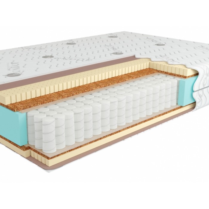 Пружинный блок -Блок состоит из пружин специальной бочкообразной формы диаметром 60 мм. Каждая пружина немного сжата и помещена в отдельный пакет из высокопрочного нетканого материала. Пакеты соеденены между собой клеем-расплавом. Специальная форма и отсутствие жёсткого соединения пружин между собой обеспечивает эффект точечного распределения нагрузок, плавность и бесшумность. 520 пружин на одно спальное место. Пружины расположены ровными рядами