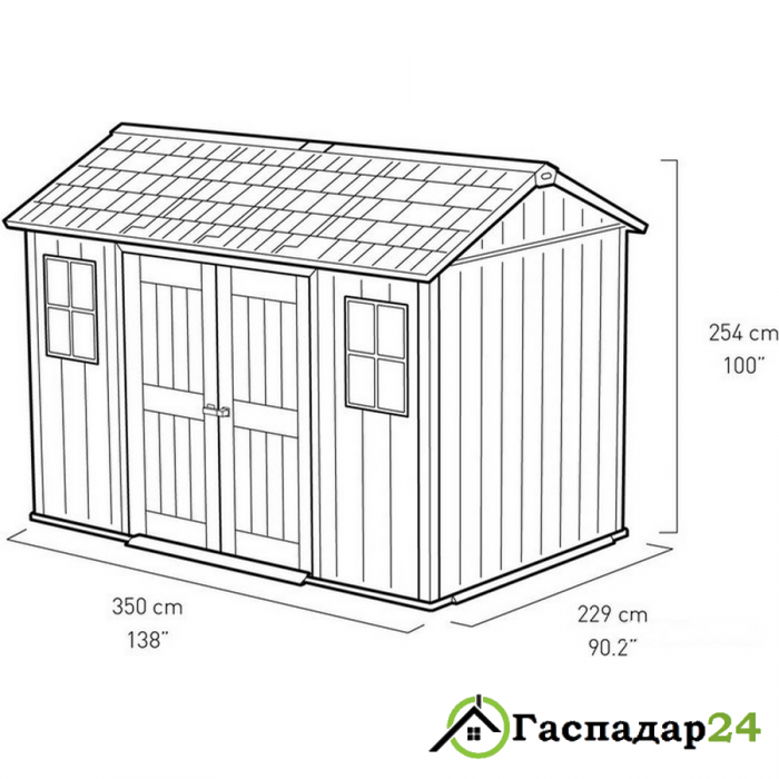 - Имеет пол. Т.е. данный садовый домик герметичен, там не прорастает трава, нет грязи. Также можно устанавливать его на любое основание из песчано-гравийной смеси или щебня, т.е. не требуется твердого основания из бетона или асфальта. Предусмотрена система водостока (в модели Horizon и более дорогих). Можно обеспечить сбор воды в емкости в определенном направлении.